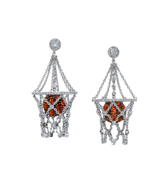 Suspended below, a fully dimensional hoop and diamond-set net drape with fluid precision, each link articulated to move with light and grace.