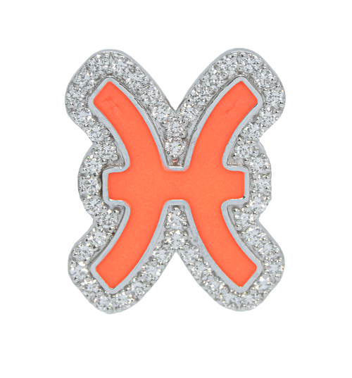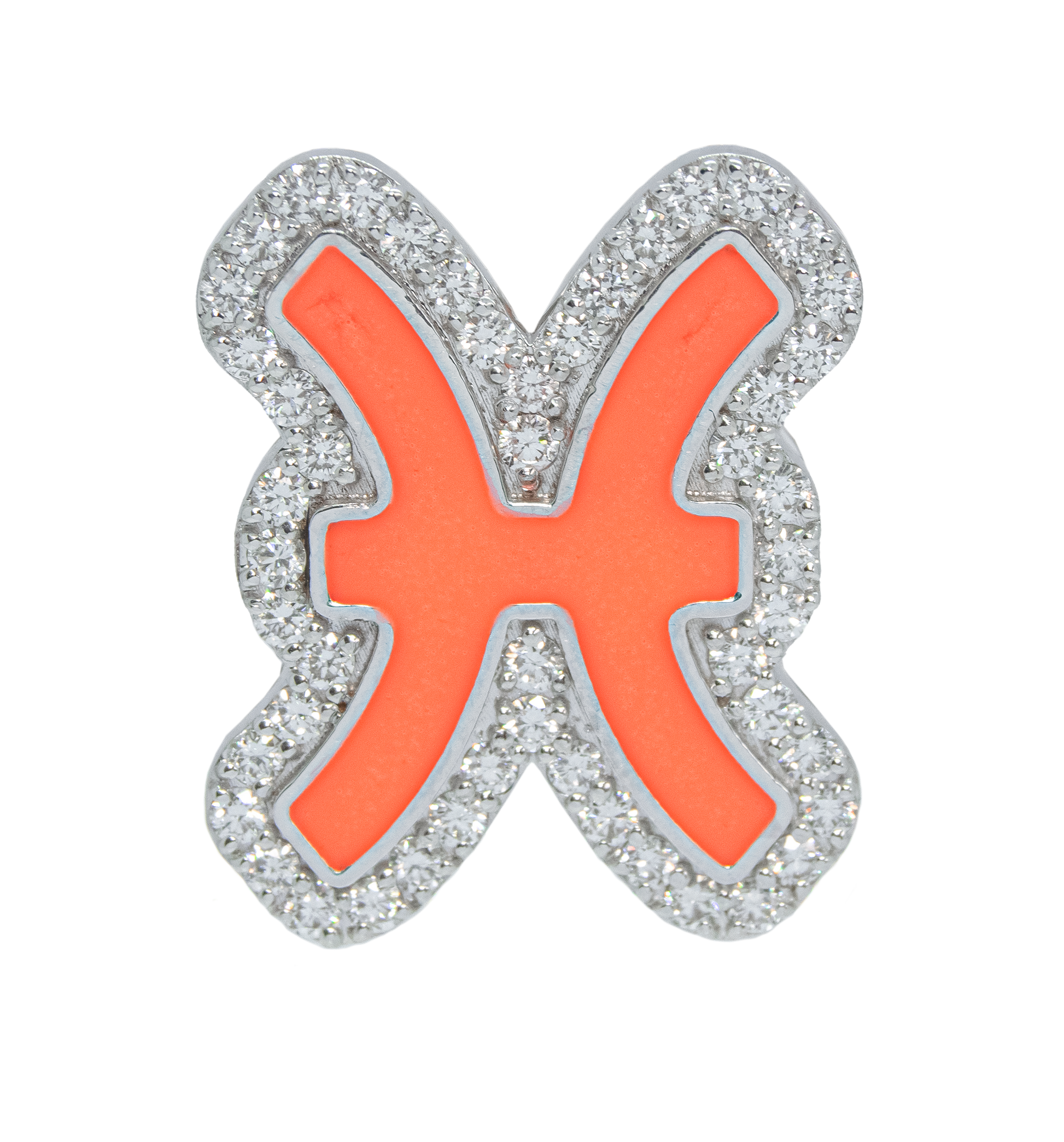 Design: Pisces zodiac symbol in pavé diamonds with neon enamel accents