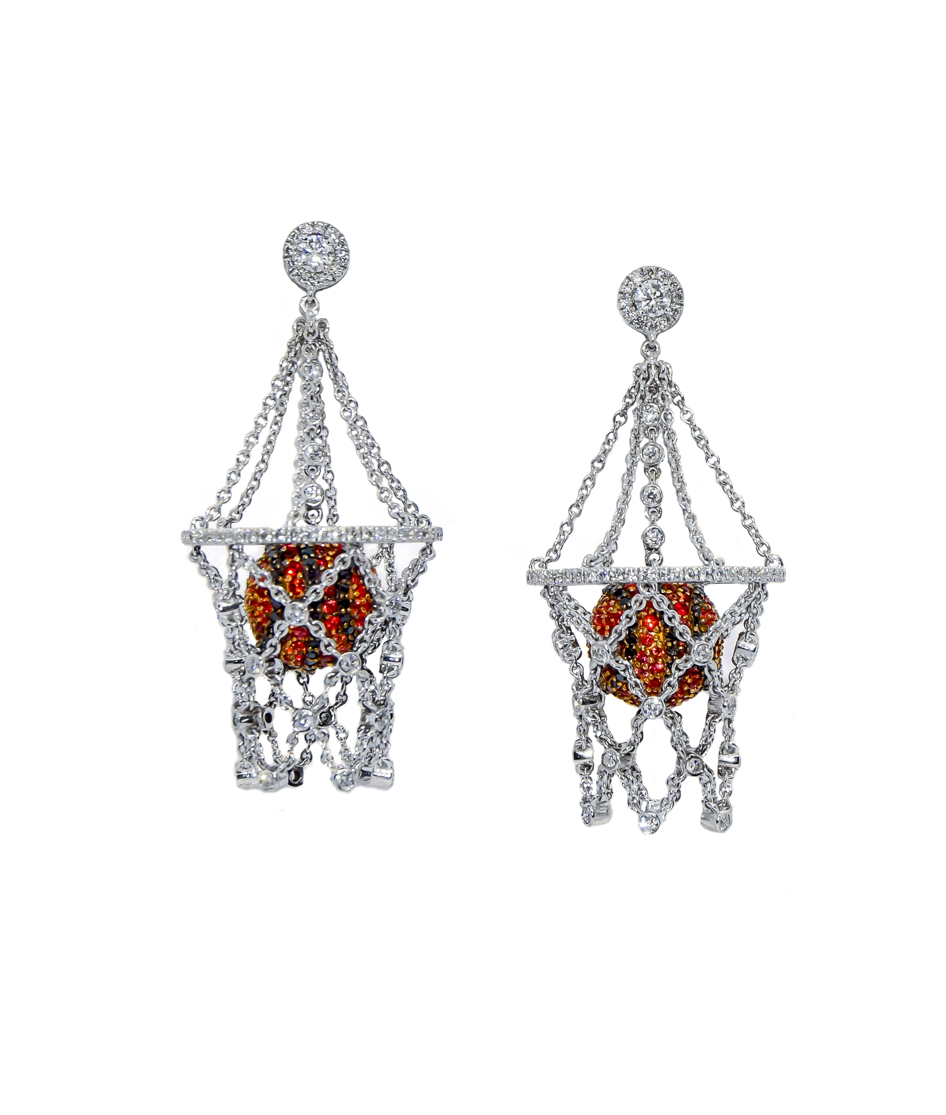 The Basketball Hoop Earrings are a bold celebration of sport and sophistication, sculpted in 18K white gold. Each earring features a meticulously handcrafted hoop design capturing a pavé-set orange sapphire basketball suspended within a net of natural white and black diamonds, merging dynamic motion with high-jewelry elegance.