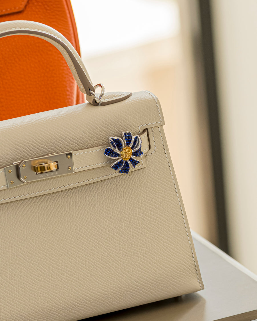 Part of the Botanical Bag Bijoux collection, this piece is designed to enhance celebrated handbags such as the Birkin 25, Kelly 25, and Kelly Cut, while easily transforming into a pendant when paired with a fine chain. Its cool-toned white gold setting and brilliant blue gemstones make it a statement accessory that embodies both timeless beauty and exceptional craftsmanship.