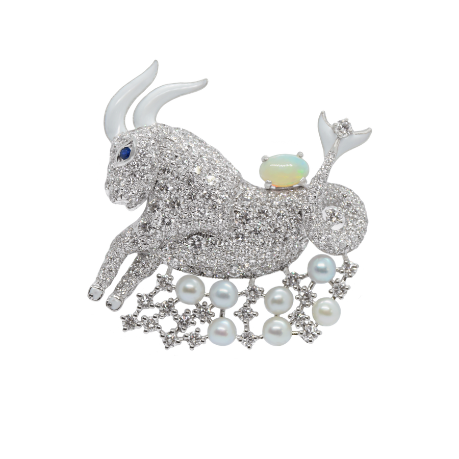 A powerful homage to ambition and resilience. The CAPRICORN Customized Bag Bijoux is crafted in gleaming 18K white gold and adorned with natural FG/VVS-VS diamonds, celestial opals, luminous pearls, and rich blue sapphires — stones selected to mirror the grounded elegance and determined nature of the Capricorn soul.