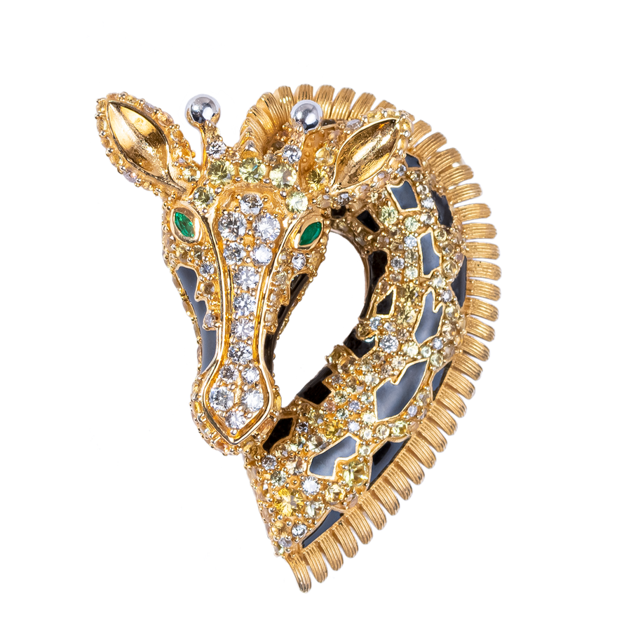 A whimsical celebration of wild elegance. The Giraffe Bag Bijoux is a sculptural icon, brought to life in polished 14K yellow gold and adorned with a vibrant array of natural SI clarity diamonds, lush emeralds, and radiant yellow sapphires. This statement piece blends nature-inspired charm with functional sophistication.