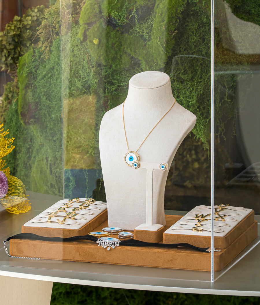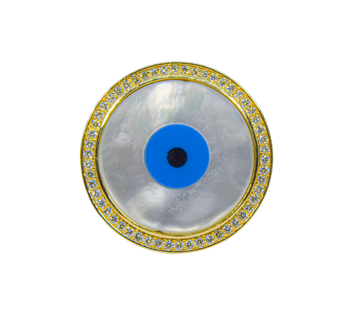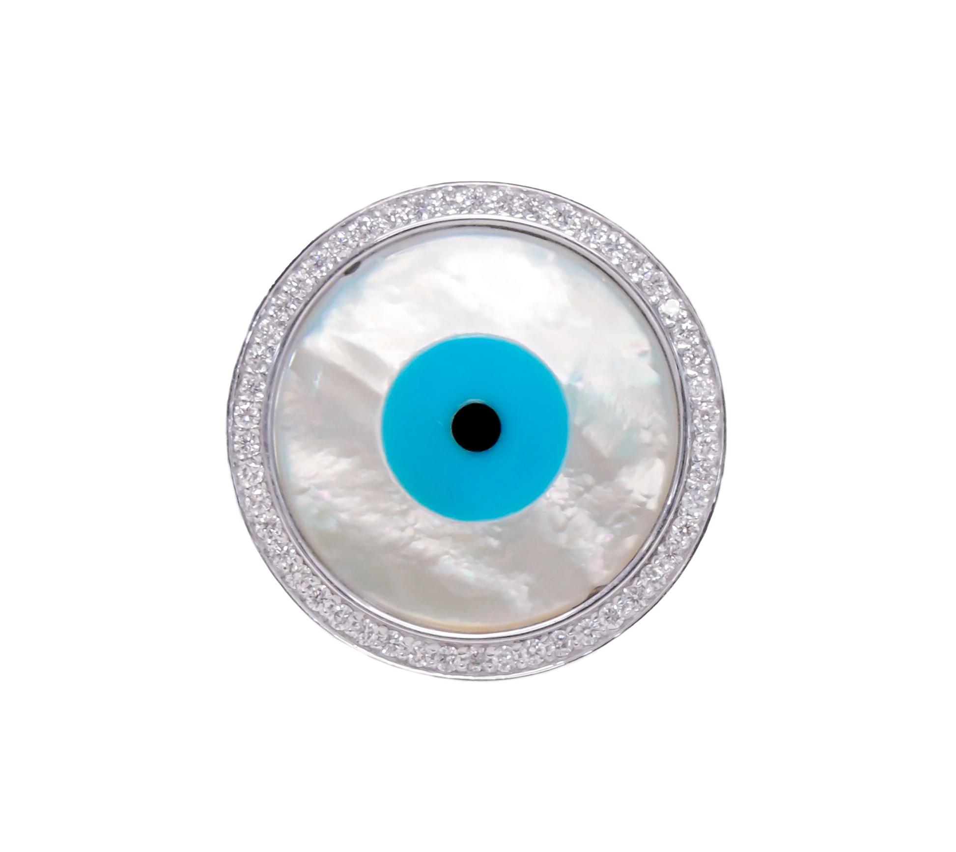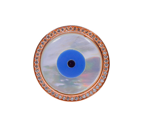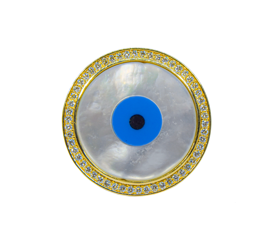Evil Eye Bag Bijoux is a luxury accessory designed to elegantly decorate and personalize your handbag. Crafted with 18kt gold, diamonds, and mother of pearl, it features the iconic evil eye design and includes approximately 0.43 carats of diamonds. This piece exemplifies the refined elegance and high-quality craftsmanship typical of Ashna Mehta’s collections.