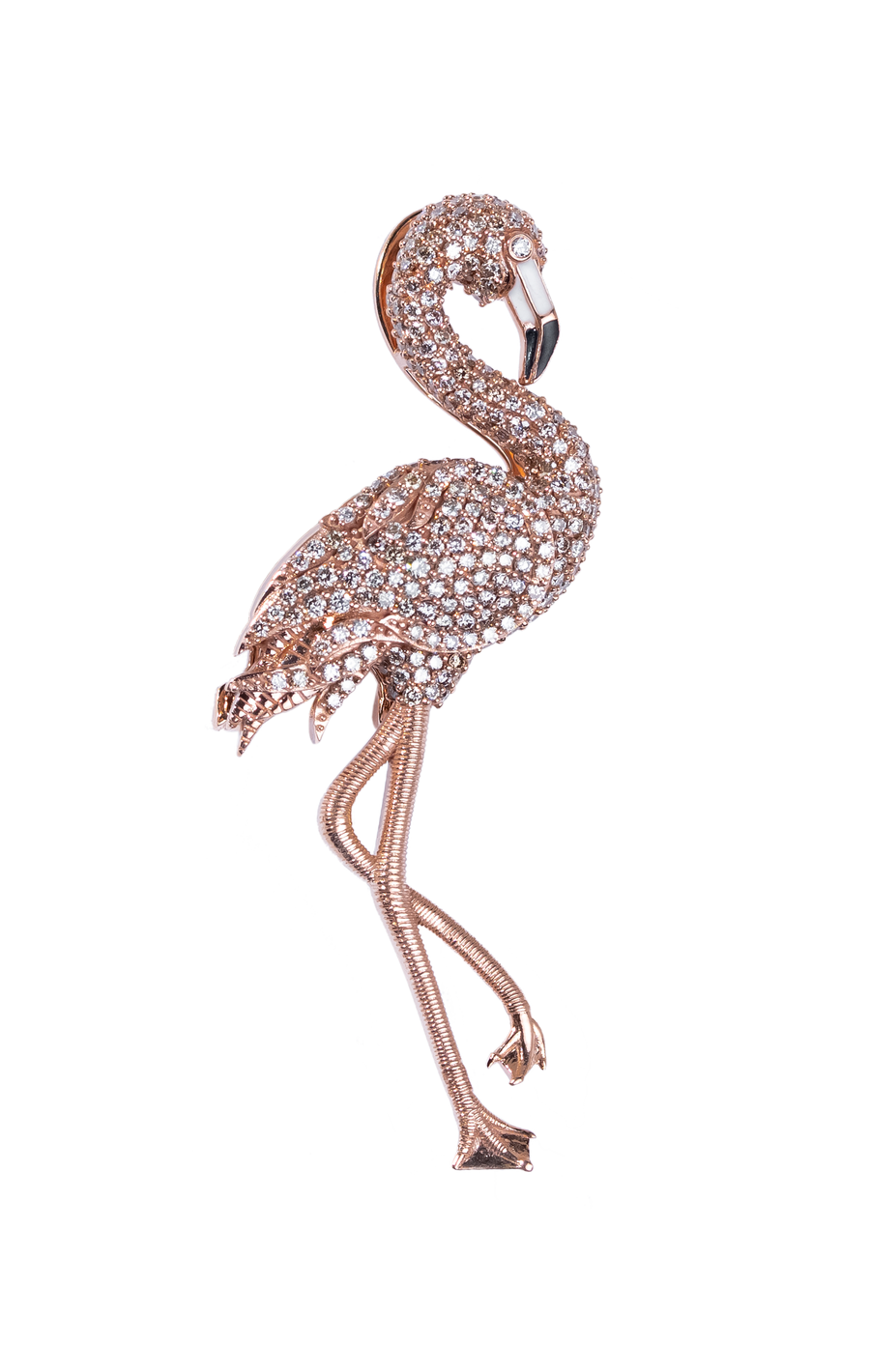 A symbol of grace, balance, and individuality. The FLAMINGO Bag Bijoux captures the elegance of this striking bird in polished 14K rose gold, accented with natural SI clarity diamonds for a soft, sparkling finish. This piece brings together whimsy and luxury in a silhouette that is both bold and refined.