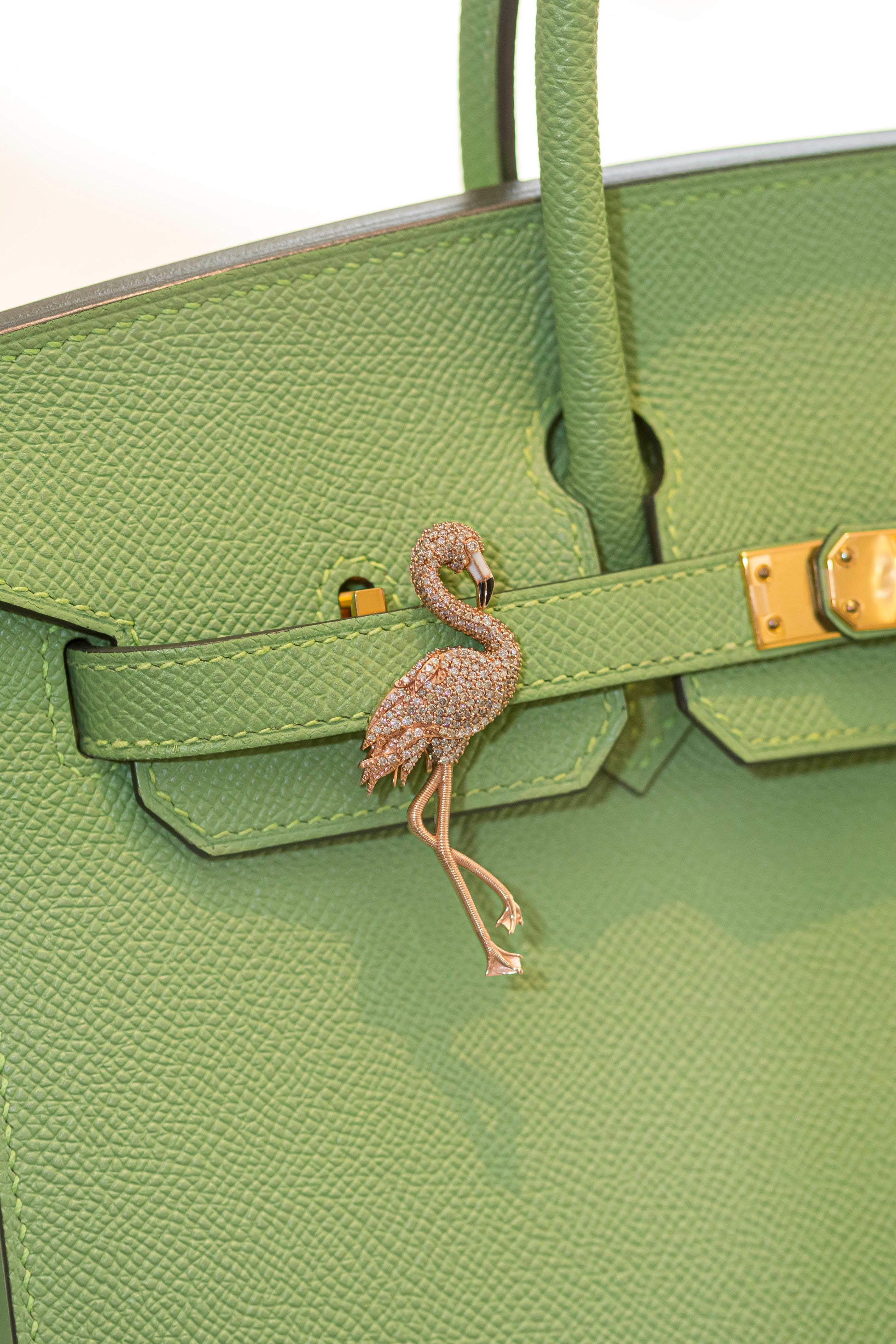 As part of the expressive Bag Bijoux collection, the FLAMINGO is thoughtfully created to complement iconic handbags such as the Birkin 25, Kelly 25, and Kelly Cut, while also transitioning seamlessly into a graceful pendant. Its sculptural form and subtle brilliance make it a unique accessory that evokes individuality and movement.