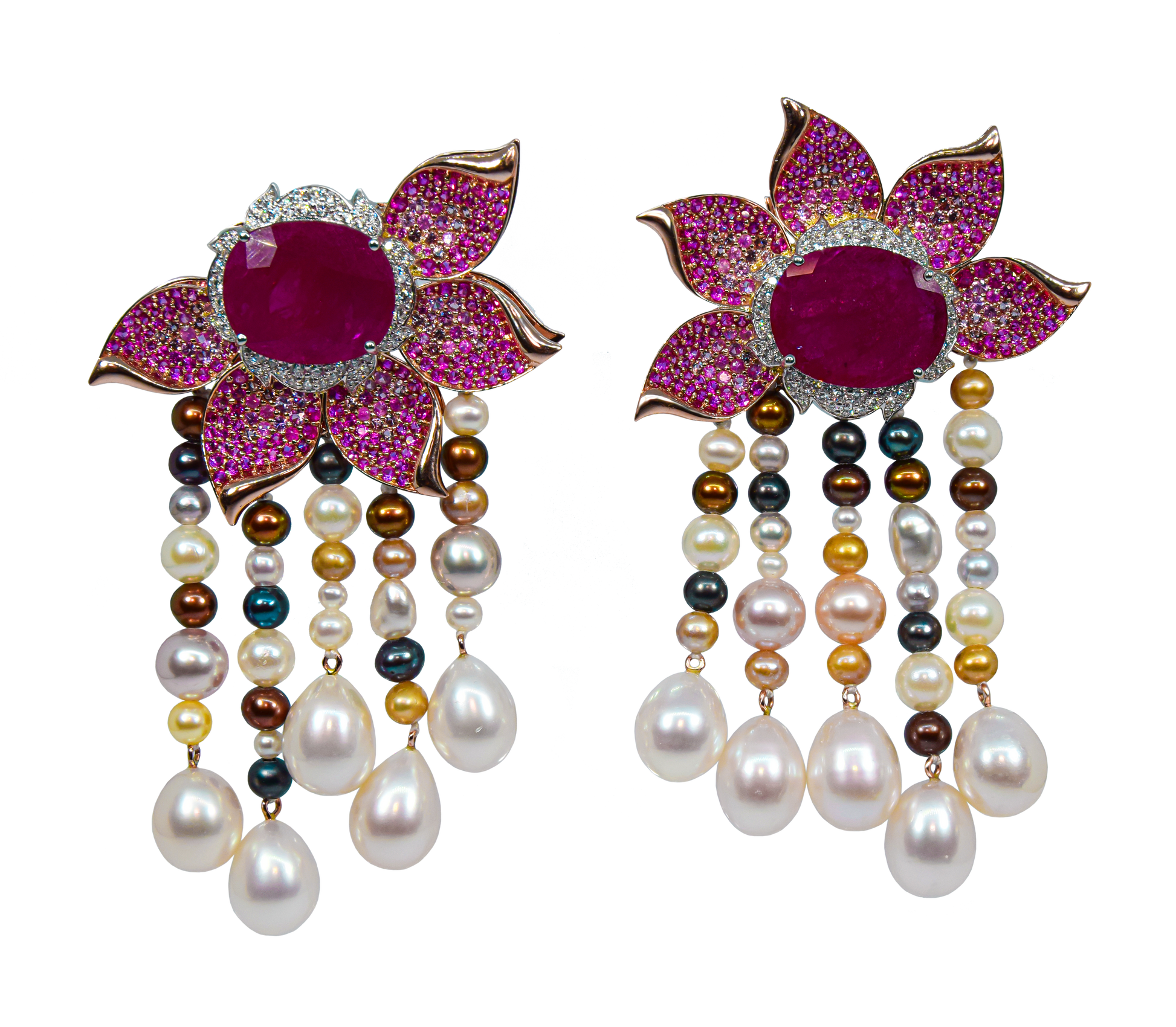 Shop this romantic 18K Rose Gold Flower Bag Bijoux with Natural Mozambique Ruby (~10.00ct), Pink Sapphires, FG/VVS-VS Diamonds & Freshwater Pearls by ASHNA MEHTA