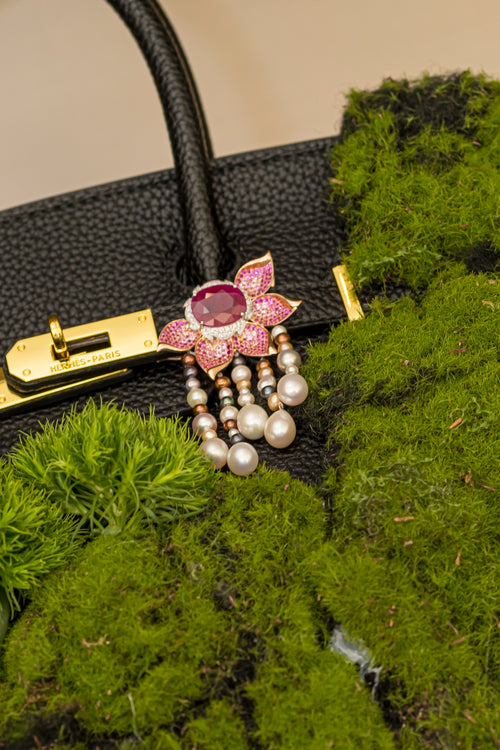 Where nature meets opulence. The Flower Bag Bijoux is a blooming masterpiece, delicately crafted in 18K rose gold and adorned with a striking ~10.00ct natural Mozambique ruby, pink sapphires, FG/VVS-VS diamonds, and freshwater pearls. Designed by Ashna Mehta, this exquisite floral creation celebrates beauty, femininity, and timeless elegance through its vibrant palette and intricate design.
