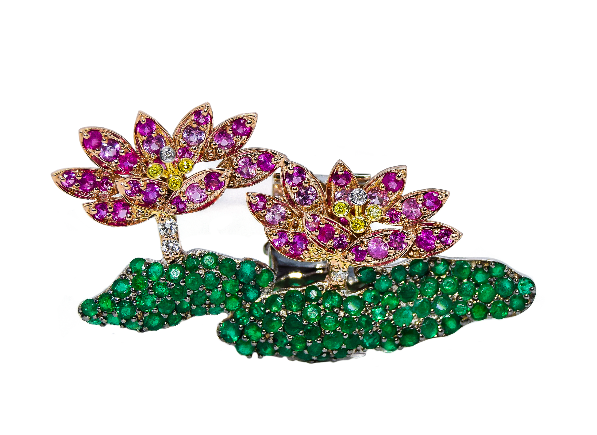 Shop this exquisite 18K White Gold & Rose Gold Lotus Flower Bag Bijoux with Natural Fancy Yellow Diamonds, White Diamonds, Pink Sapphires & Emeralds by ASHNA MEHTA