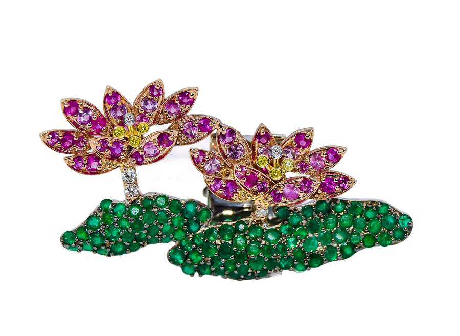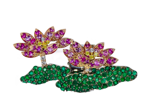 Where beauty blooms in brilliance. The Lotus Flower Bag Bijoux is a radiant tribute to purity, renewal, and inner strength—masterfully crafted in a striking mix of 18K white and rose gold. Designed by Ashna Mehta, this sculptural piece comes to life through a vibrant floral arrangement of natural fancy yellow diamonds, FG/VVS-VS white diamonds, natural pink sapphires, and emeralds.