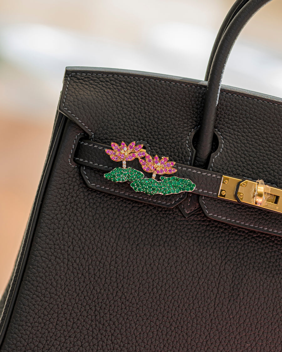 Part of the signature Bag Bijoux collection, this vibrant piece is designed to complement Hermès icons like the Birkin 25, Kelly 25, and Kelly Cut. With its symbolic lotus motif and exceptional gemstone detailing, it effortlessly transitions from a high-jewelry bag charm to a statement pendant—infusing elegance with spiritual grace.