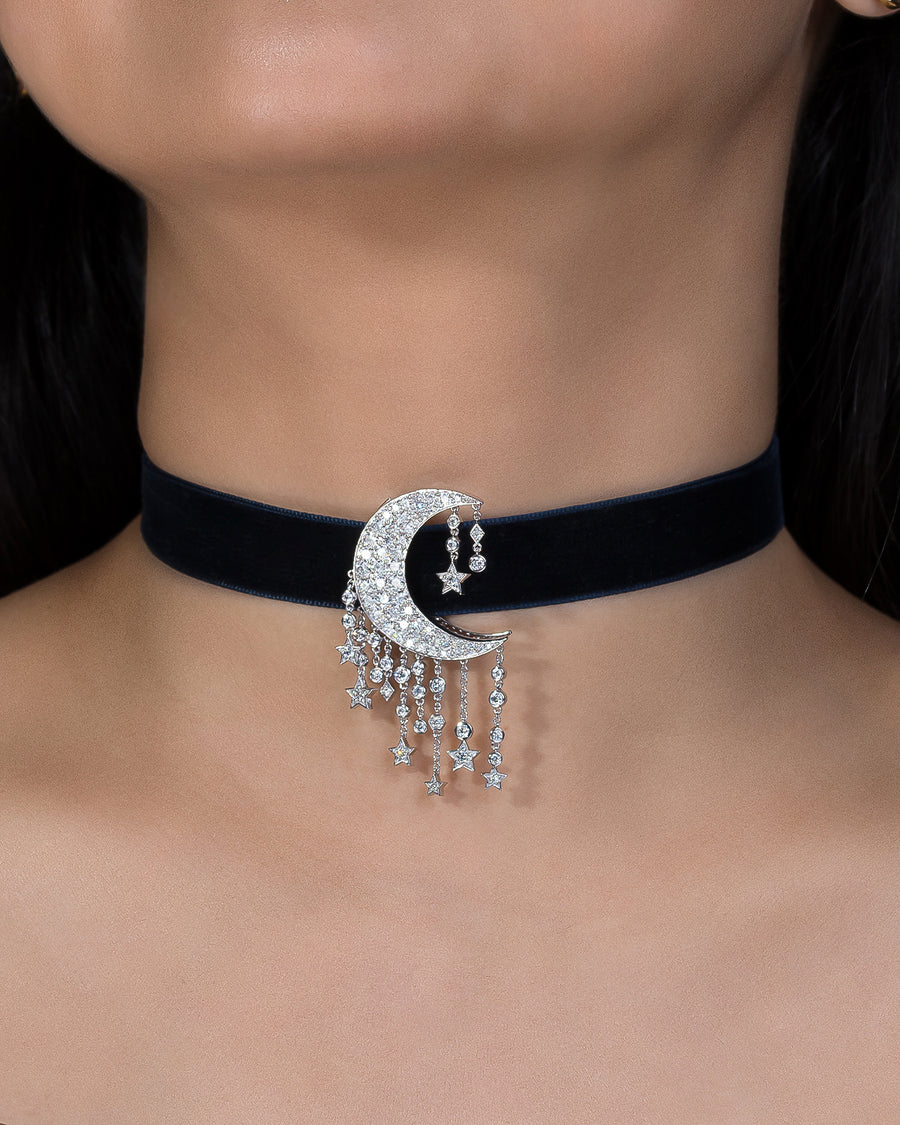 A radiant ode to celestial beauty. The Crescent Moon Bag Bijoux captures the poetic arc of the night sky, cast in polished 18K white gold and illuminated with natural FG/VVS-VS clarity diamonds. This refined piece embodies intuition, serenity, and timeless elegance.