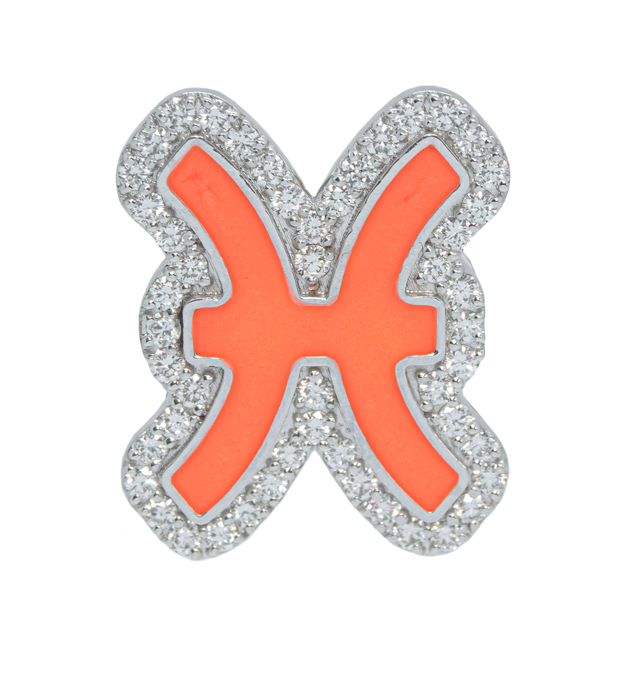 Design: Pisces zodiac symbol in pavé diamonds with neon enamel accents