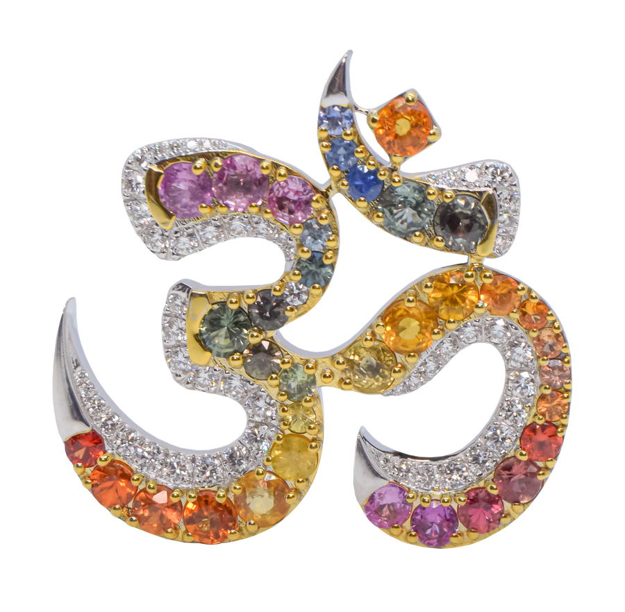 Shop this spiritual 18K White Gold OM Bag Bijoux with Natural FG/VVS-VS Diamonds & Multi-Colored Sapphires by ASHNA MEHTA