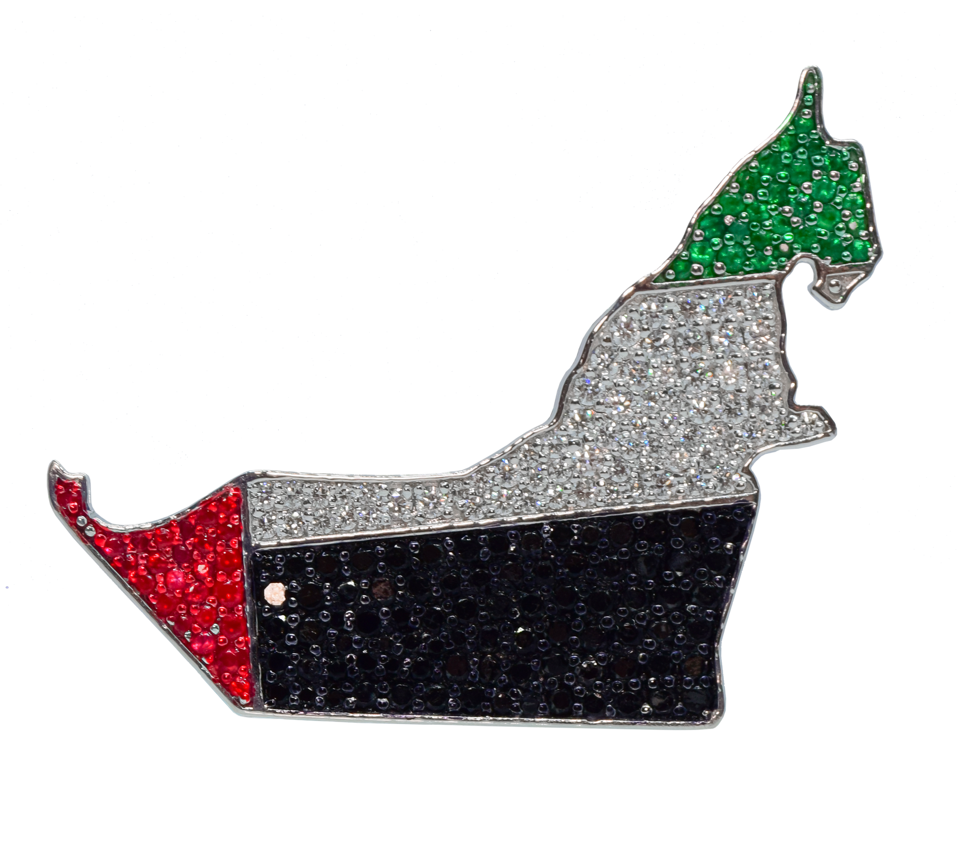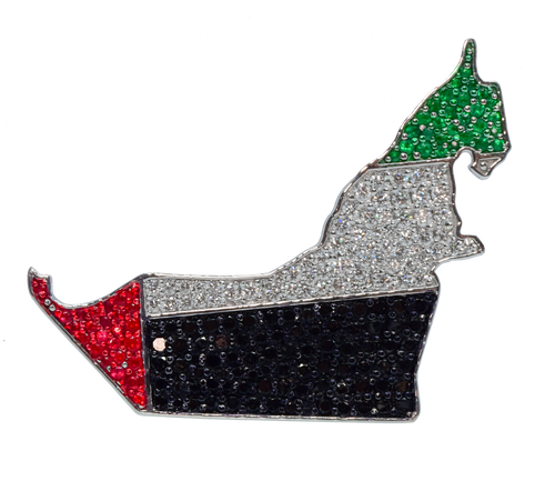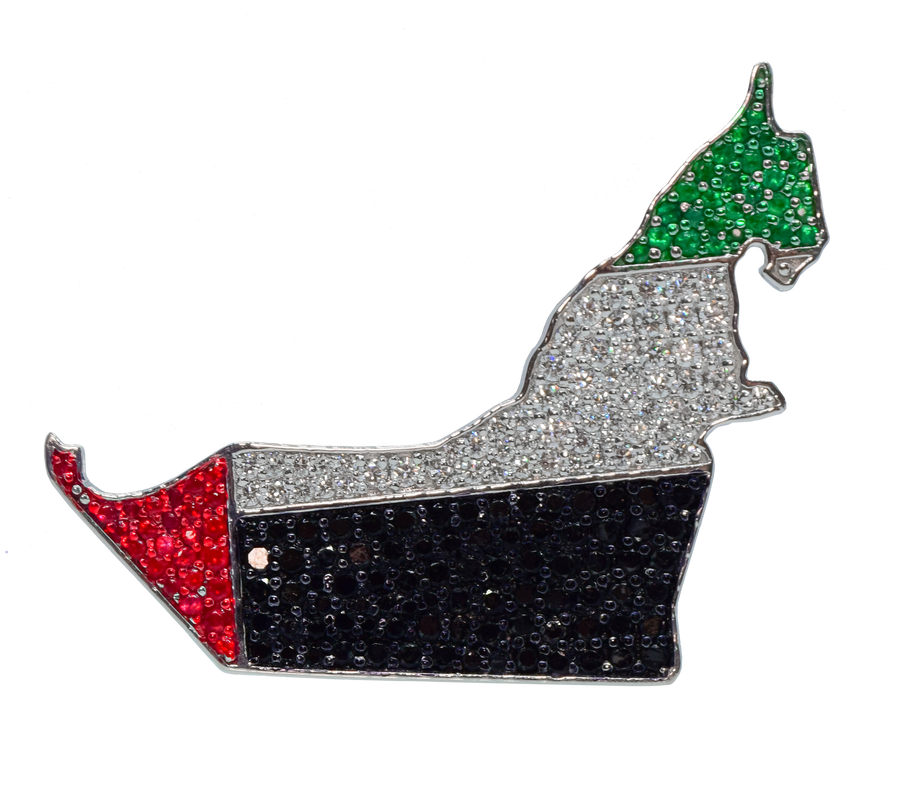 Where elegance meets national pride. The UAE Flag Bag Bijoux is a powerful emblem of heritage and identity, beautifully crafted in luminous 18K white gold and set with natural FG/VVS-VS diamonds, black diamonds, emeralds, and a single vivid ruby. This piece transforms the spirit of the United Arab Emirates into wearable art.