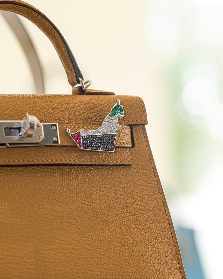 As part of the signature Bag Bijoux collection, this timeless piece is designed to enhance the beauty of Hermès staples like the Birkin 25, Kelly 25, and Kelly Cut. With a gemstone arrangement that mirrors the UAE flag, it seamlessly transitions from statement bag charm to collectible pendant—merging symbolic meaning with contemporary elegance.